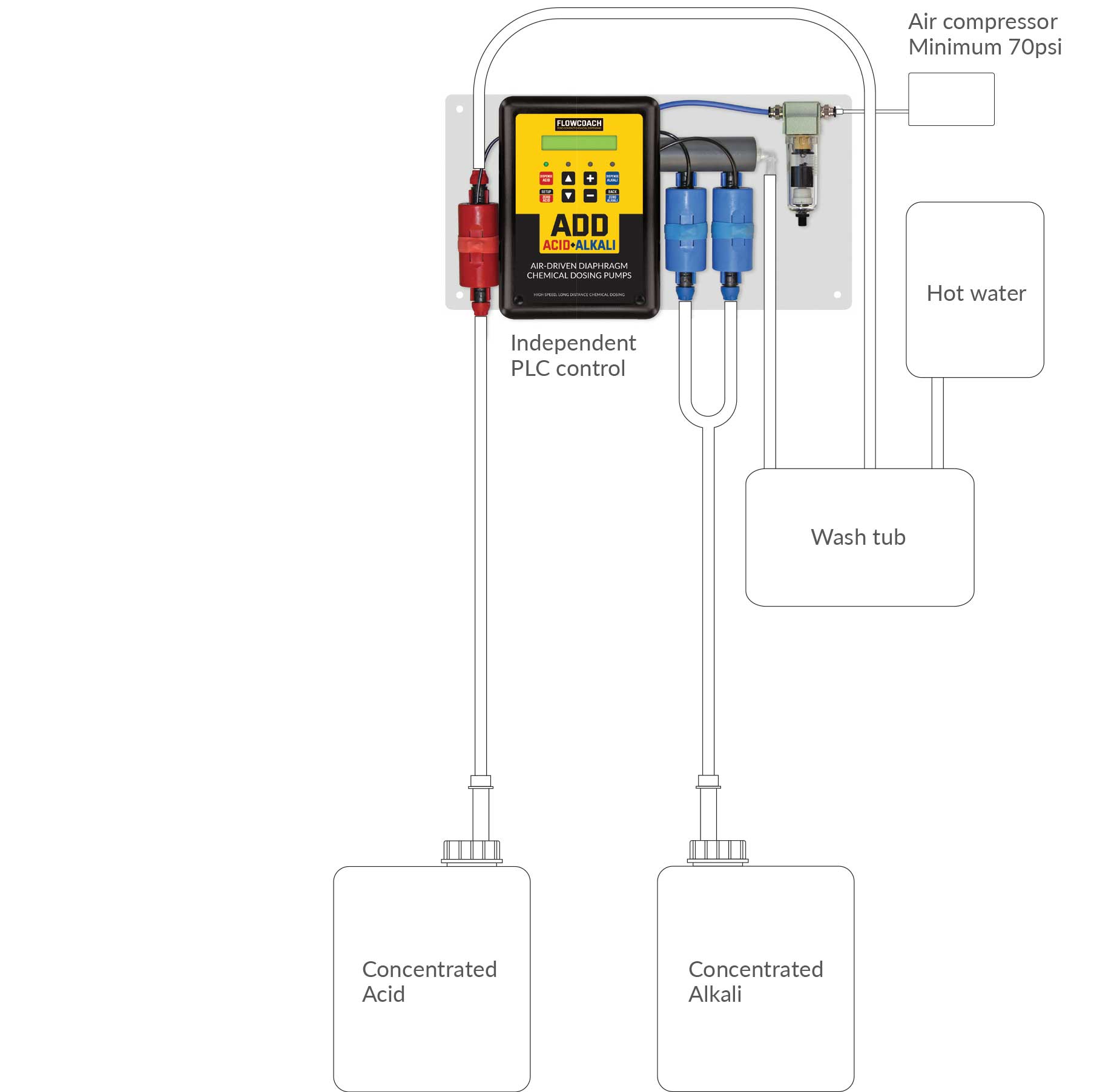 Combination of 1 x Acid Pump and 2 x Alkali pumps both independently managed using two separate user programmed volume outputs.